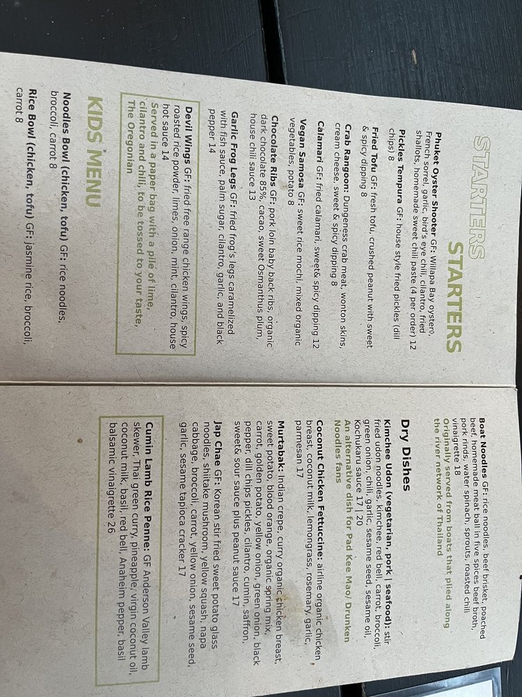 Fried free range chicken wings, spicy roasted rice powder, lime, onion, mint, cilantro, house hot sauce. Served in a paper bag with a pile of lime, cilantro and chili, to be tossed to your taste, the oregonian. Gluten-free.